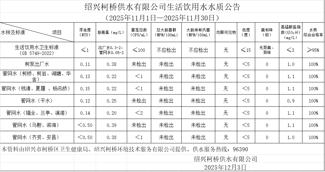 生活飲用水水質公告(2025年11月1日—2025年11月30日)
